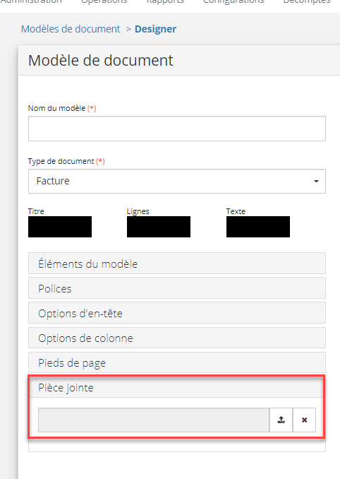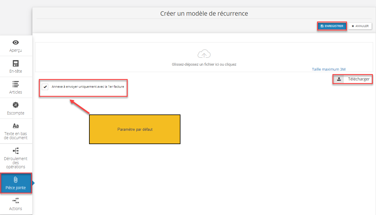 Dans le module de création de factures (ponctuelles ou récurrentes), vous pouvez télécharger une pièce jointe dans l’onglet « pièce jointe » :