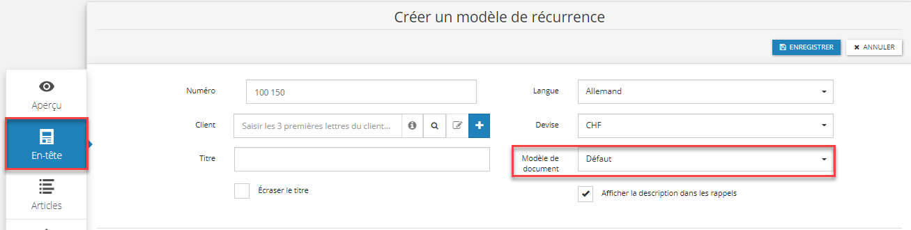 Ensuite, que vous créiez des factures ponctuelles ou des récurrences, il suffit de choisir le modèle de document souhaité dans l’onglet « En-tête » dans le menu d'édition des offres/bons de travail/factures :